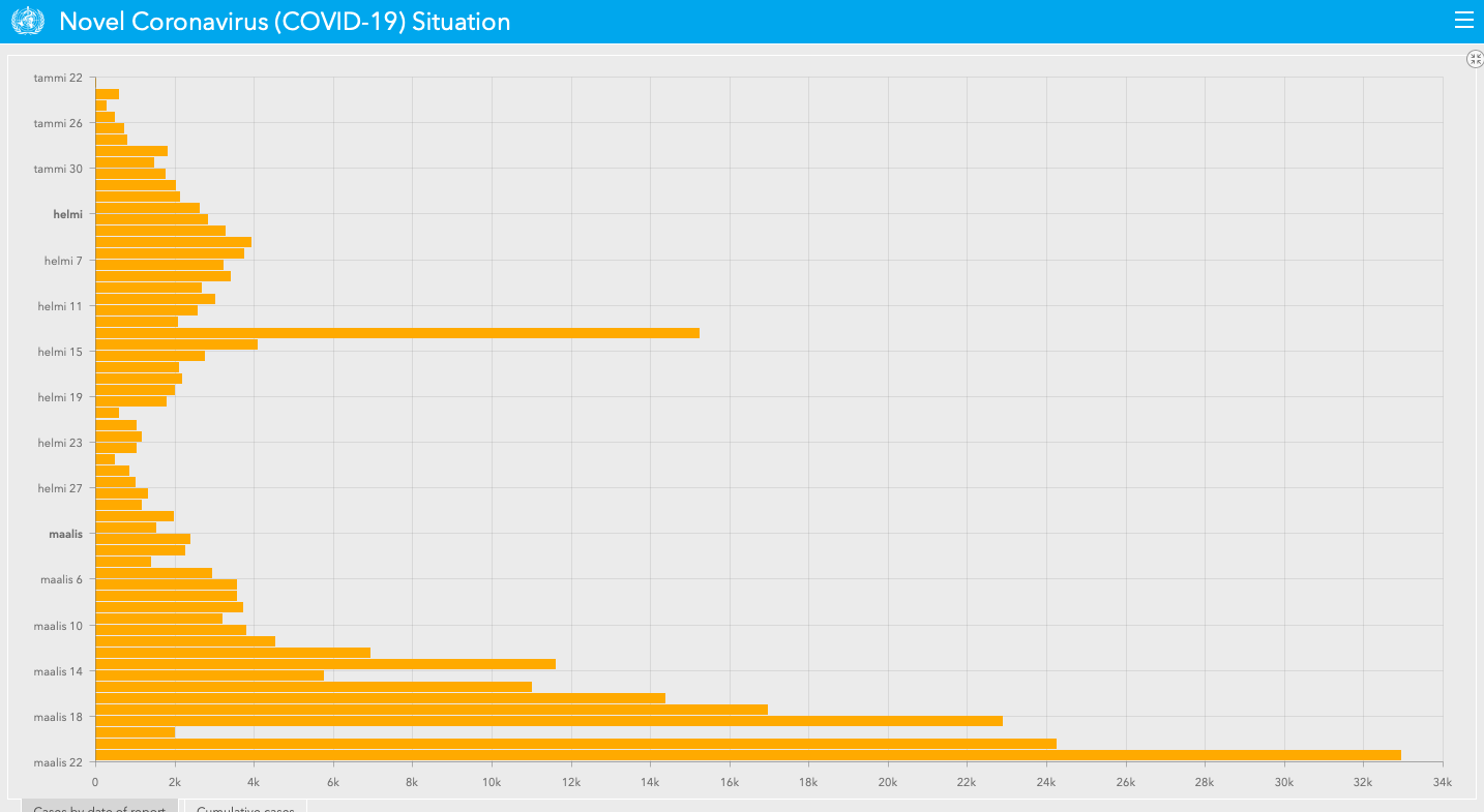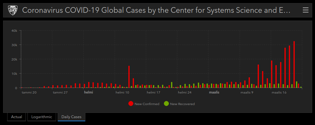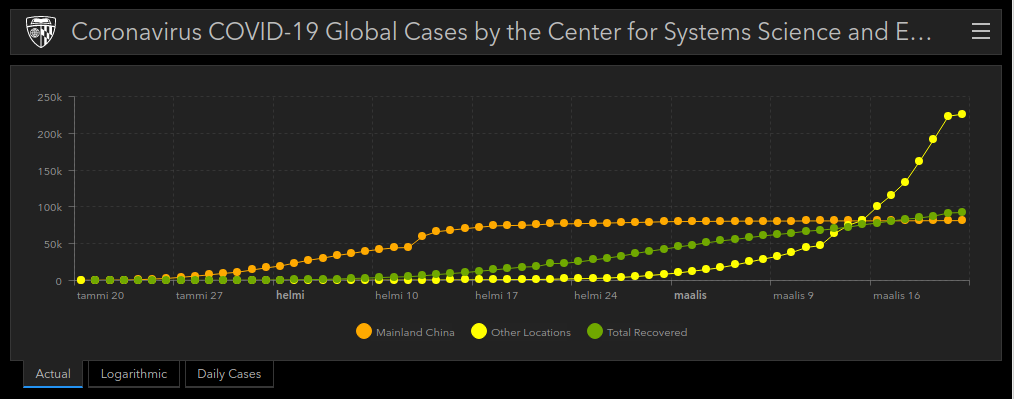 Tuossa WHO kuvassa taitaa olla jo tämänkin päivän "testatut/havaitut" tapaukset. Hopkinsilla vain päivään 20 asti.