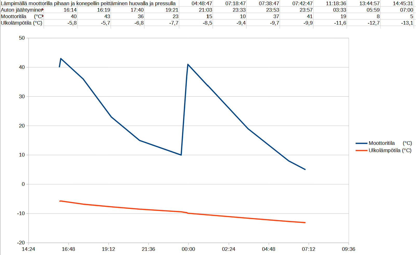 Minulla ei ole autossani lohkolämmitintä ja webasto on rikki, joten päätin kokeilla, miten toimisi konepellin peittely. Minulla on maskin peittämisen takia valmiiksi asennettuna hälyttävä moottoritilan lämpömittari. Kirjailin tuon mittarin lämpötiloja ja ulkolämpötiloja ylös vastaisen varalle.