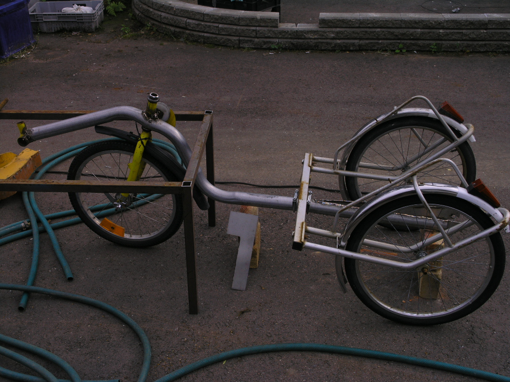 Tuon toisen kolmirattaisen rojektin vähän muhiessa tajusin ett pihalla lojuu tuo perinnöksi saatu helkama kontti peräkärry. Rupesin sitä sovittamaan tuon ensimmäisen tekemäni metallirunkoisen nojiksen pw1 perään. Homma näyttää helpolta, etuvetosen matalan pyörän runko ja etupää johon parilla pakoputkilemmarilla peräkärrin poikkiaisa kiinni. Takahaarukkaan pitää tehdä jonkinlainen ripustus tuon kontin haarukoihin. Muovikontin ja veto aisan purin ensin pois. Pyörän kampikeskiö pitää korjata siinä on ollu vikaa.