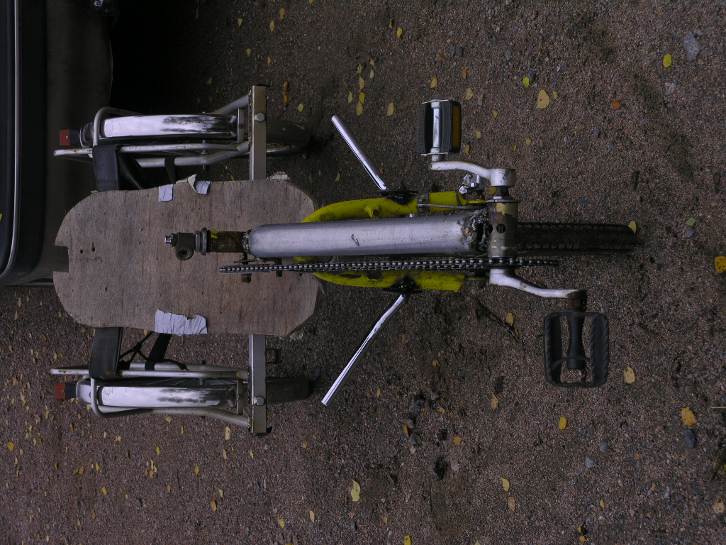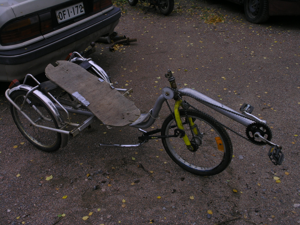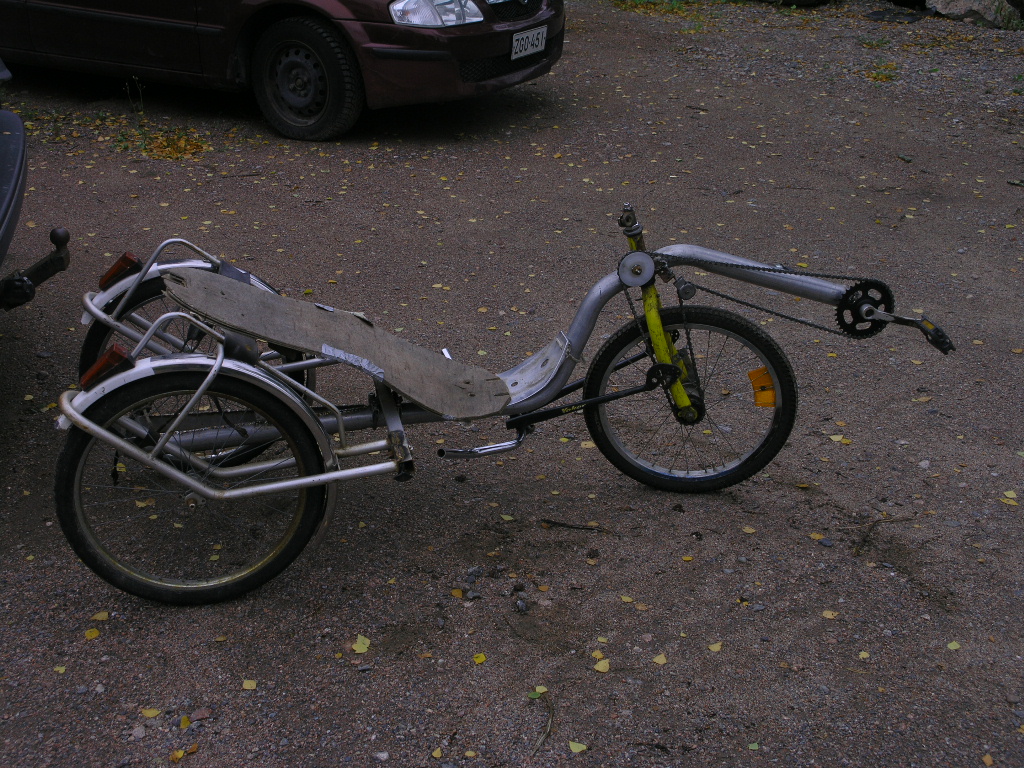 Itte taas ajelin vähän ja kyllähän tuohon tottuu. Poljin kammet tuossa on 125mm lasten pyörästä, kuten myös ratas. Ei polvet varmaan tuon kanssa rasitu mutt toisaalta joutuu käyttämään aika pieniä välityksiä noin lyhyillä kammilla. Vähän semmosta "sitkuttamista"