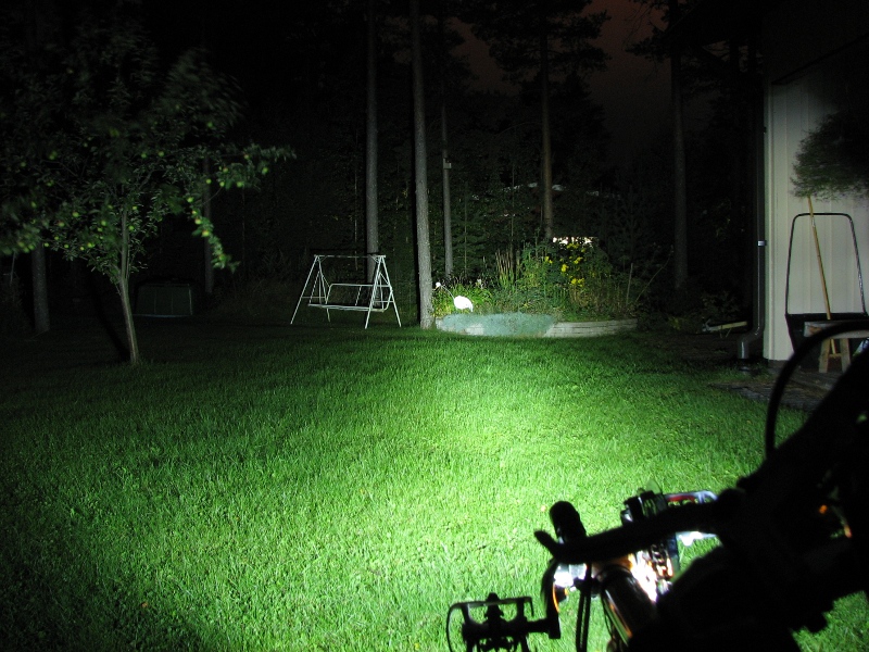 Suuntaus jutska... TrustFire on suunnattu tuohon lintuun ja MagicShine suurinpiirtein siten ettei vastaantulija kovin pahasti sokaistu ;) TrustFiren valokeila on pyöräilyyn turhan kapea, oikeastaan ainoa hyvä asennuspaikka sille olisi kypärän päällä...