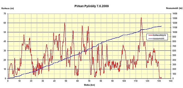 Rustasin vielä Pirkan reitistä kuvaajan: punaisella korkeuskäyrä ja sinisellä nousumetrit.