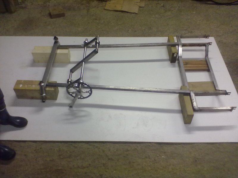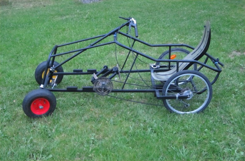 Sain hieman edistystä tähän hommaan, poljinveivi on hitsattu kasaan ja rungon putket olisi hitsausta vailla. Etupyöriä ei ole vastaan kävellyt, mutta laitan "väliaikaiset" kottikärryn pyörät. 4-pyöräisestä saa helposti lyhyemmän kuin deltatrikestä, eikä painossa häviä paljoa koska runko on yksinkertaisempi. Yksi kysymysmerkki on, että kun en meinaa laittaa nivelöityä etuakselia niin mahtaako tulla jotain ongelmia? Kun laite on takapainoinen, niin tuskin ainakaan takapyörän pidon kanssa. Kuvia tulee myöhemmin kunhan saan kameran.