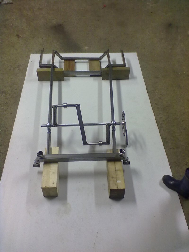 Polkuauton perusrunko on hitsattu kasaan. Seuraavaksi ohjelmassa on polkimien ja voimalinjan virittely. Sen jälkeen pitäisi hakea lopullinen korin muoto. Rungon päälle tulee materiaalia johon taustalla oleva kennolevy kiinnittyy. Korin mallina tulee olemaan Ford -32 Roadster, poikkeaa hieman aiemmasta mallista jossa vielä oli Bugatti- tyyppinen “veneperä”.