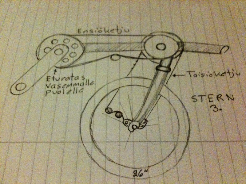 Jospa ei siirtäisikään kampikeskiötä vasemmalle puolelle vaan taitekohtaan laittaisi kaksi tai kolmerattaisen keskiön, jonka yhden rattaan kautta kulkisi ensiöketju ja toisen rattaan kautta toisioketju. Silloin voisi käyttää vakiovaihtajia ja ketjunkiristäjiä. ![]()