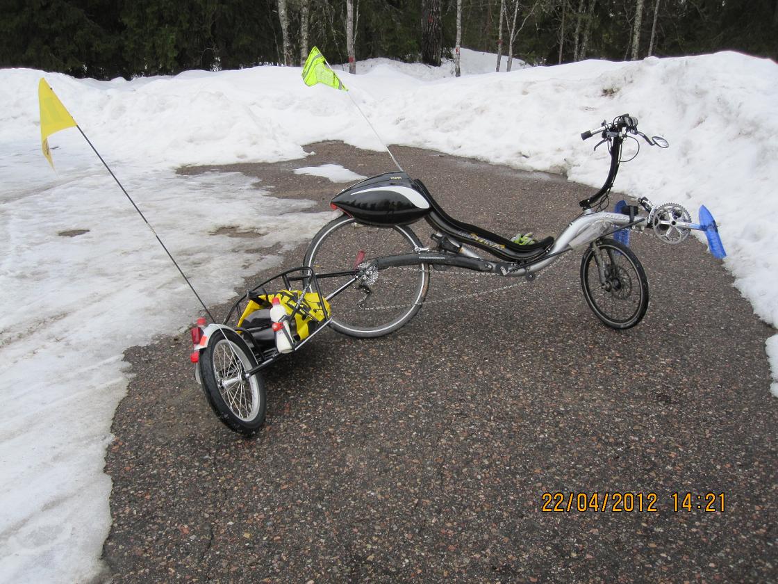 Kärry ekaa kertaa Pioneerin perässä. Ihan niin rauhallisesti ei käyttäytynyt kuin Optiman perässä, fundeerasin mistä voisi johtua niin päädyin löysempään takahaarukkaan. Jos on töyssyistä ja samaan aikaan mutkittelee niin huomattavasti enemmän tuntuu epävakautta. Suoraa ajaessa ajellessa ja tasaisella alustalla ei tunnu mitään kummempaa, 45 km/h alamäessä oli ihan ok. 35 km/h myötätuuleen veivatessa tuntui kivalta nopeudelta.