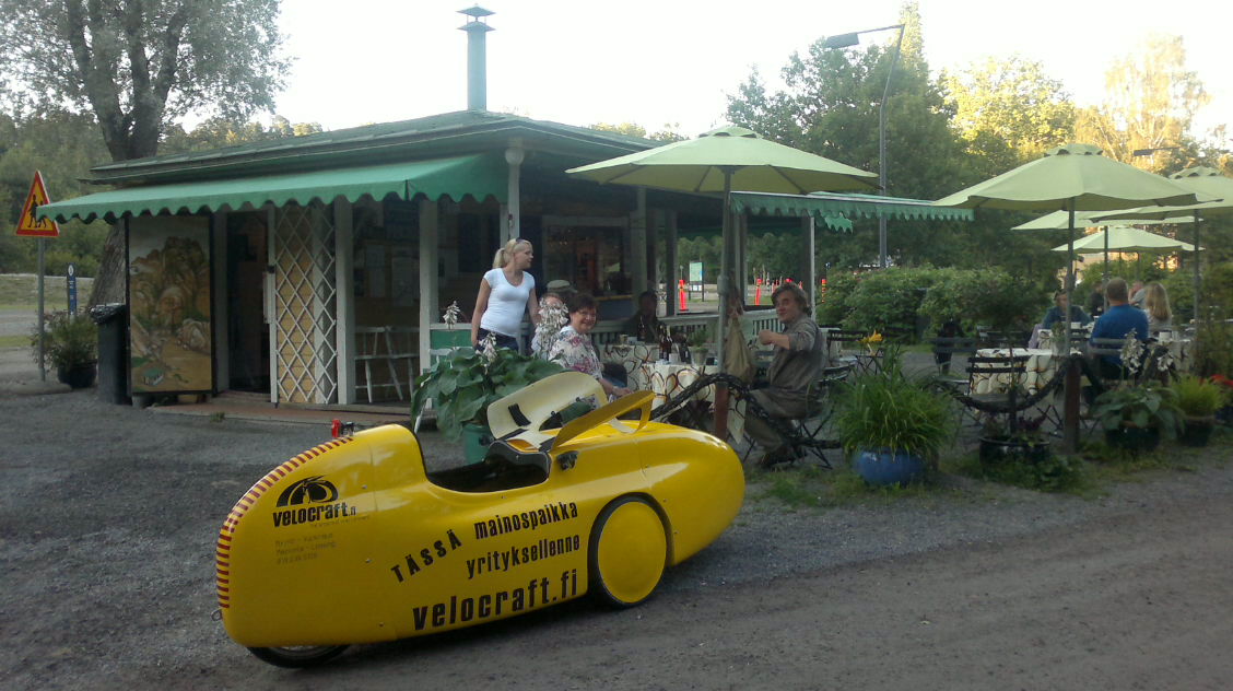 Kesän lämpimin yö 21 astetta ja oli se katto liikaa eli kuuma tuli nopeasti. No ukkoskuuron reunusta pukkasi ja vettä tuli kuin aisaa ja visiiri piti avata eli naama ja kaula kastui mutta näkipähän jotain, se mitä näki ei ollut kovin kaukana koska minun mielestä valot on aivan liian heikkotehoiset ja väärässä paikassa (ladatut akut vaihdoin kyllä valoihin), nyt puolet valokeilasta hyväilee kinnerin kylkeä eli valot pitäisi eteen asentaa ja tehoa lisää, välillä mentiin melkein vaiston ja valkoisen reunaviivan varassa. Vedenpoistoreiät pitäisi myös löytyä koska rankkasateella pyörän ollessa paikallaan katon reunoista pääsee vesi sisään ja jonkinmoiset lammikot lattialle jää, samoin myös visiiri auki ajaessa. n. 60 km/h vauhdeissa visiiri rupeaa vapättämään aika ikävästi, parhaimmillaan keskari oli yli 36 km/h mutta viimeinen iso mäki tiputti heti 2 km/h ja loppu on muuten hitaampaa. Katosta on myös se huono puoli, että kuski ei voi kurkotella eteenpäin jos haluaa nähdä lähemmäs pyörän keulaan.