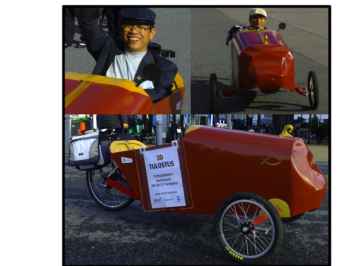 Testasimme kuinka tämä toimii omatekoisella mobiilillla messuilla. Nuoli lähti Alihankintamessuille markkinoimaan 3D-tulostustapahtumaa ajelemalla Tampereen messukeskuksen pihamailla, järjestäjän luvalla.