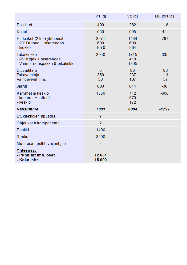 Taulukon perusteella tavoite on ihan mahdollinen. Hieman parempikin tulos on saavutettavissa, jos loput palikat pysyvät maksimissaan V1:n osien painoissa. Esimerkiksi penkissä on vielä merkittävä painon pudotus potentiaali, arviolta ainakin 400 … 500 g. Jopa 12 … 12.5 kg saattaisi olla ihan realistinen jos rungosta ja muista osista saa höylättyä jotain pientä (V1:ssä mm. melko paljon pultteja, prikkoja ja muttereita).