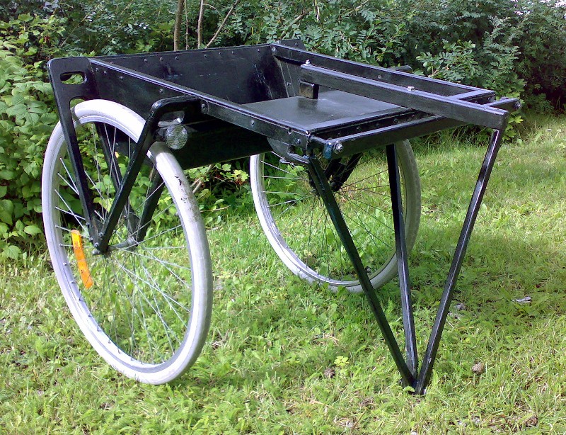 Haarukat ovat 18 mm koivuvaneria ja lava on 0,7 mm:n AL-levyä. Haapainen jalkatuki on kokoon taitettava. On tosi kevyt ja oikeastaan aivan toimiva, ja annankin sen Maija-tyttären käyttöön.