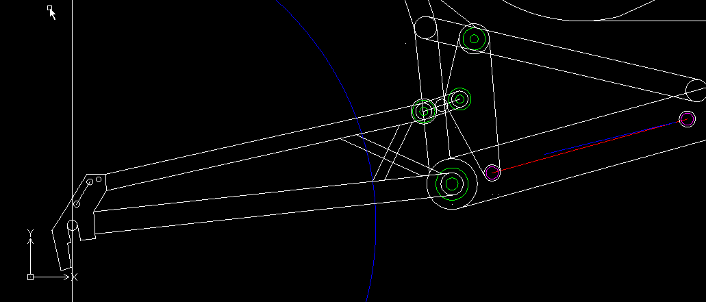 Kannattaa piirroksissa piirtää nivel vain niihin kohtiin, joissa se oikeasti on. Käsittääkseni tuossa haarukan ja tukivarren liitoksessa ei ainakaan kahta niveltä tarvita. Myös rungon liitoksiin piirretyt ympyrät vain haittaavat hahmottamista.