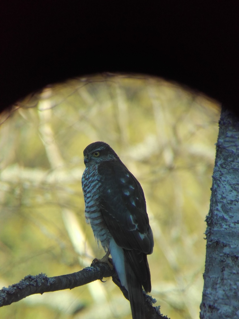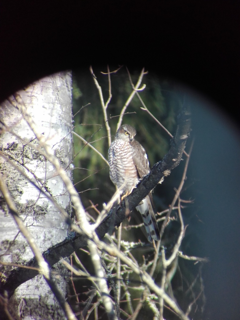 Varpushaukkana tuota pidettiin. Pari yritystä teki lintulaudan suuntaan mutta ei saanut tinttejä kiinni. Kun haukka istui tiheässä kuusessa niin tiaiset tuli samaan puuhun hyppelemään mutta eivät menneet lintulaudalle joka oli siinä vieressä.