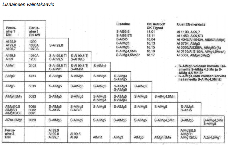 Lisäaineeksi käytetään 18.15 lisäainetta, joka on S-AlMg5 seosta. Tässä vielä lisäainetaulukko, jos käytät tukipalana jotain muuta alumiinia.
