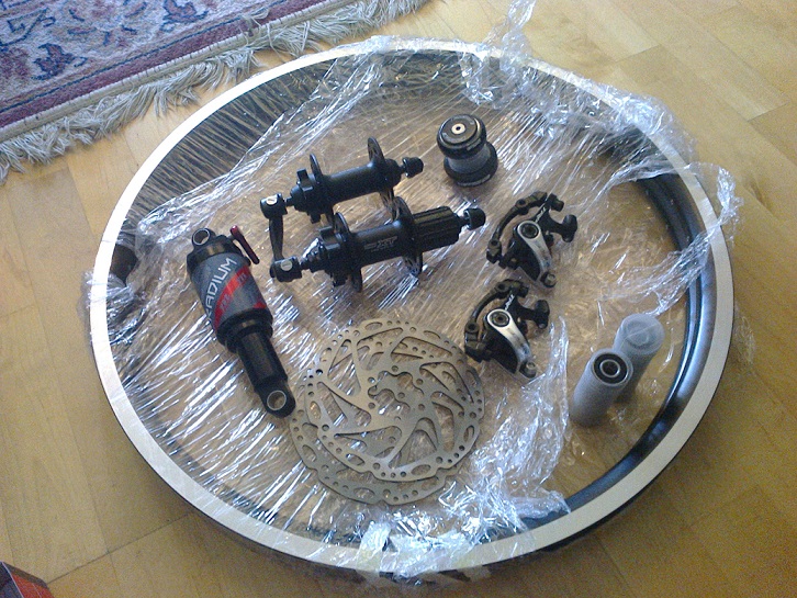 Pinnat tuli joten kasasin kiekot, tarkempi rihtaus vielä tekemättä. Etukiekossa pinnojen pituus oli sopiva, takakiekossa odotan kauhulla meneekö pinna pohjaan asti ennenku kiristyy.. Samalla tuli huomattua että trp:n spyret ei ainakaan ilman spacereitä mahdu paikalleen, koska ottaa pinnoihin. Sen verran leveät satulat. Itse tekemässä haarukassa on onneksi paljon tilaa levylle joten prikkaa väliin vaan..
