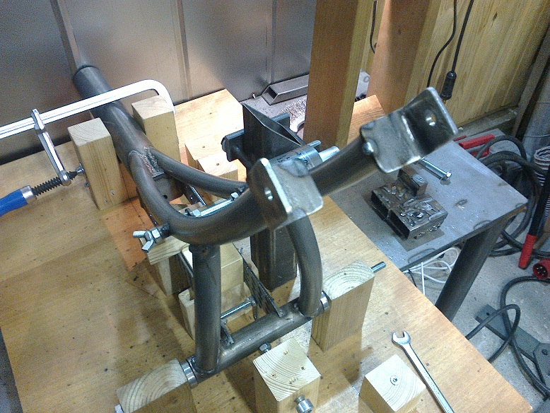 Keskirungon jigi lähes kokonaan valmis, puuttuu enää teleskooppiliitoksen kiristykselle tuet. On kyllä ollu sopivan haastava projekti :shock: kaikki pitää miettiä myös siltä kantilta, että on helppoa purkaa ja kasata. Ja osan tuista pitää olla helposti irrotettavissa, jotta saa riittävän laajalta alalta hitsattua kiinni vetelyn välttämiseksi. Tämän jälkeen täytyy tehdä se yksiputkirunkoinen, ja miettiä miksi piti tehdä näin vaikeasti :D