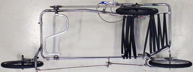 Vilijami tekee kai peilikuvan, eli oikealta vetävän ja vasemmalta ohjattavan. Mietin tuossa aamulla töihin ajaessani, että tuostahan saattaisi olla vain hyötyä, kun kuskin takapuoli mahtuisi vieläkin lähemmäs vetävän pyörän tasoa ja vieläkin suurempi osa painosta olisi vetävällä pyörällä. Toki siihen täytyy tehdä pidempi kampiakseli, joka kurkottaa enemmän oikealle, koska ketjulinja tulee rungon ulkopuolelle oikealle, mutta tämähän vain helpottaa rungon kuormituksia ja mahdollistaa kapeamman rungon mitoituksen.