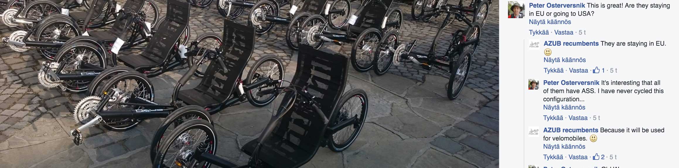 Azubilla oli tänään valmistumassa 20 trikeä - yläohjauksessa. Asiaa ihmetelleille sieltä vastattiin että triket oli menoissa velomobiileihin. Mikäs se semmoinen malli olikaan?
