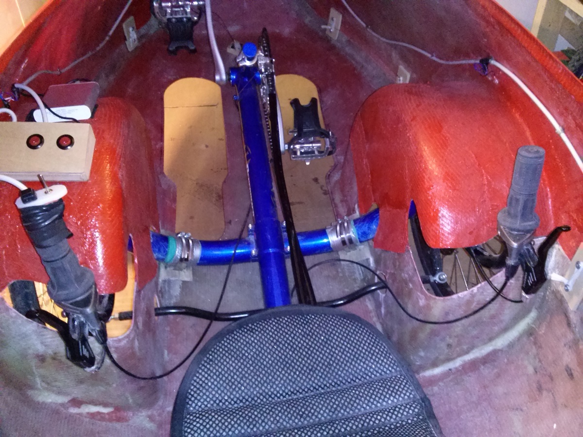Pari kuvaa sisältä. Tähän protoon haluttiin laittaa pyörä sisälle mahdollisimman pienillä muutoksilla (jarrukahvat on käännetty toisin pain, mutta ei muita muutoksia) ja siksi pyöräkoteloissa on noin isot kolot ohjauskahvoja varten. Alaohjauksella riittäisi reiät raidetangolle. Ei kuitenkaan heitä vettä sisälle märällä kelillä. Vilkut ja äänimerkki ovat kiinni vasemmassa kahvassa, powerina 5v virtapankki ja vilkkujen, ajovalojen, äänimerkin ja takavalon sähköt menee yläpuoliskoon kiinnitettyä johtoa myöten.