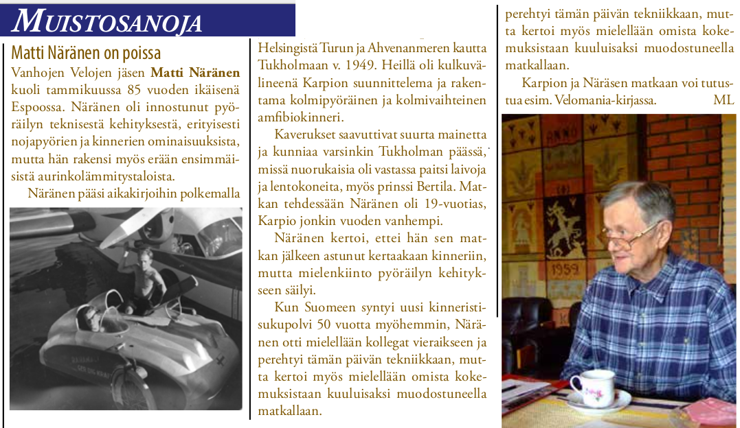 Olen itse alunperin kuullut lähinnä "kinneristä", koska isoveljen ikäpolvi rakenteli sellaisia tavallisten isojen pyörien osista 1950-luvulla ainakin täällä Helsingissä ja oletan samaa tehdyn monin paikoin. Suurin osa kinnereistä oli avoimia, mutta oli myös hienoja katettuja. Monirunkoveneiden pioneerina sittemmin tunnettu insinööri, jonka nimi ei tätä kirjoittaessa muistu mieleen rakensi katetun amfibiokinnerin, jolla hän kaverinsa kanssa polki erinäisten kommellusten jälkeen ainakin mannermaalta Ahvenanmaalle ellei Ruotsiinkin. Pääsin nuorena poikana kerran katsomaan hänen rakentamaansa trimaraania. Moottoripyöräharrastuksessa sana "trike" tuli itselle tutuksi. Molemmat käyttökelpoiset sanat tarkoittanevat samaa.