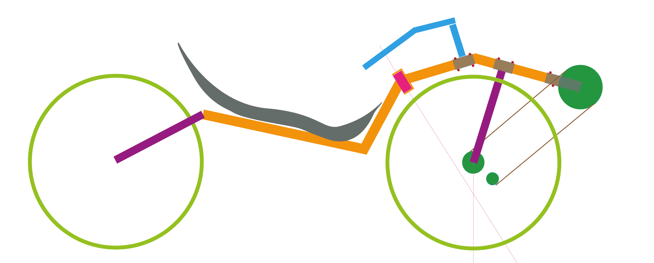 Aattelin että 40 millinen neliskanttiputki olis kätevää - silloin voisi noita liikuteltavia elementtejä laittaa 45-2 millisestä kanttiputkesta väsättyinä siihen kiinni. Poljinkeskiö liikkuisi - kuten ohjaustangon paikka ja mikse hiukan toi etuhaarukka -jolloin jättöäkin voisi hiukan testata.