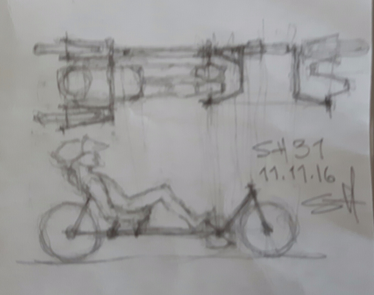 Olen Turkissa halpisreissulla, jonka aikana päässä on pyörinyt alla oleva nojapyöräidea. Täytyi viimein piirtää kuva vapaalla kädellä ilman skaalatikkua. Tavoitteena on tehdä nojis, johon olisi mahdollisimman helppo istua.