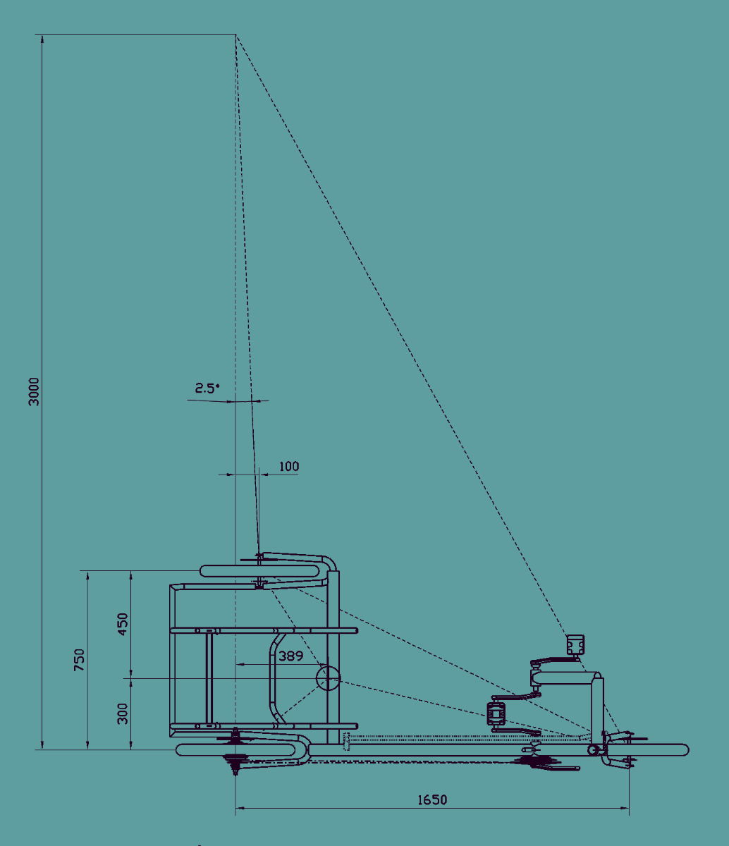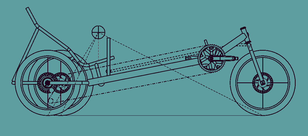 Tein skissin samasta aiheesta, mutta toisinpäin niin että runko on oikealla puolella. Näin saa ketjun eri puolelle kuin jalat. Penkki on sivussa keskilinjasta jotta vetopyörälle jää enemmän painoa (=pitoa). Jos tuollaisen tekee, voi kokeilla sietääkö vapaa takarengas olla edempänä, tässä aluksi 100 milliä.