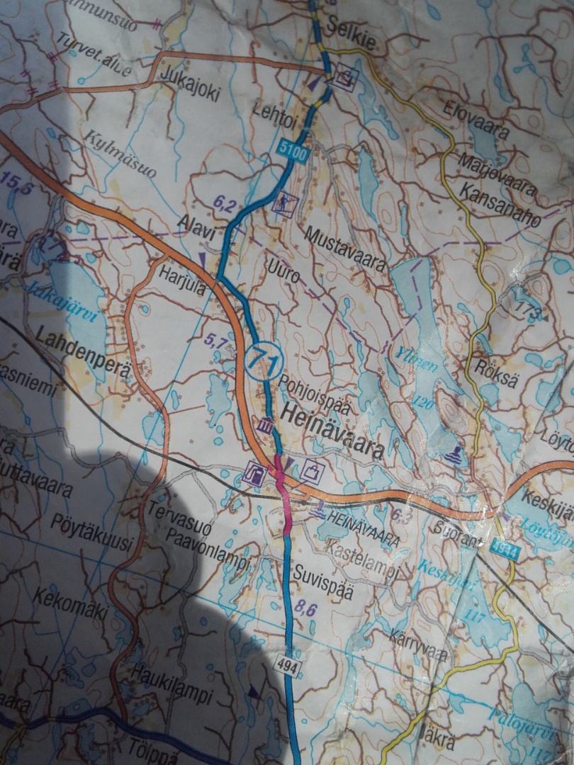 Ruokaa oli ainakin riittävästi ja vatsa turvoksissa sotkimme Uimaharjulle isompaa valtatietä. Mäet oli loivempia mutta asfaltti kehnoa kylätielaatua ilman piennarta (paitsi vikat 3km), rekkoja tarpeeksi mutta osasivat ohittamisen.