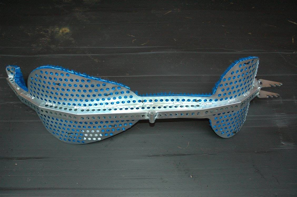 The seat is made in 2013 from ordinary steel 1mm, cut with a laser and welded, everything is simple. Thanks to the minimal form and a lot of holes, the seat is light enough. With brackets 1.9kg.
