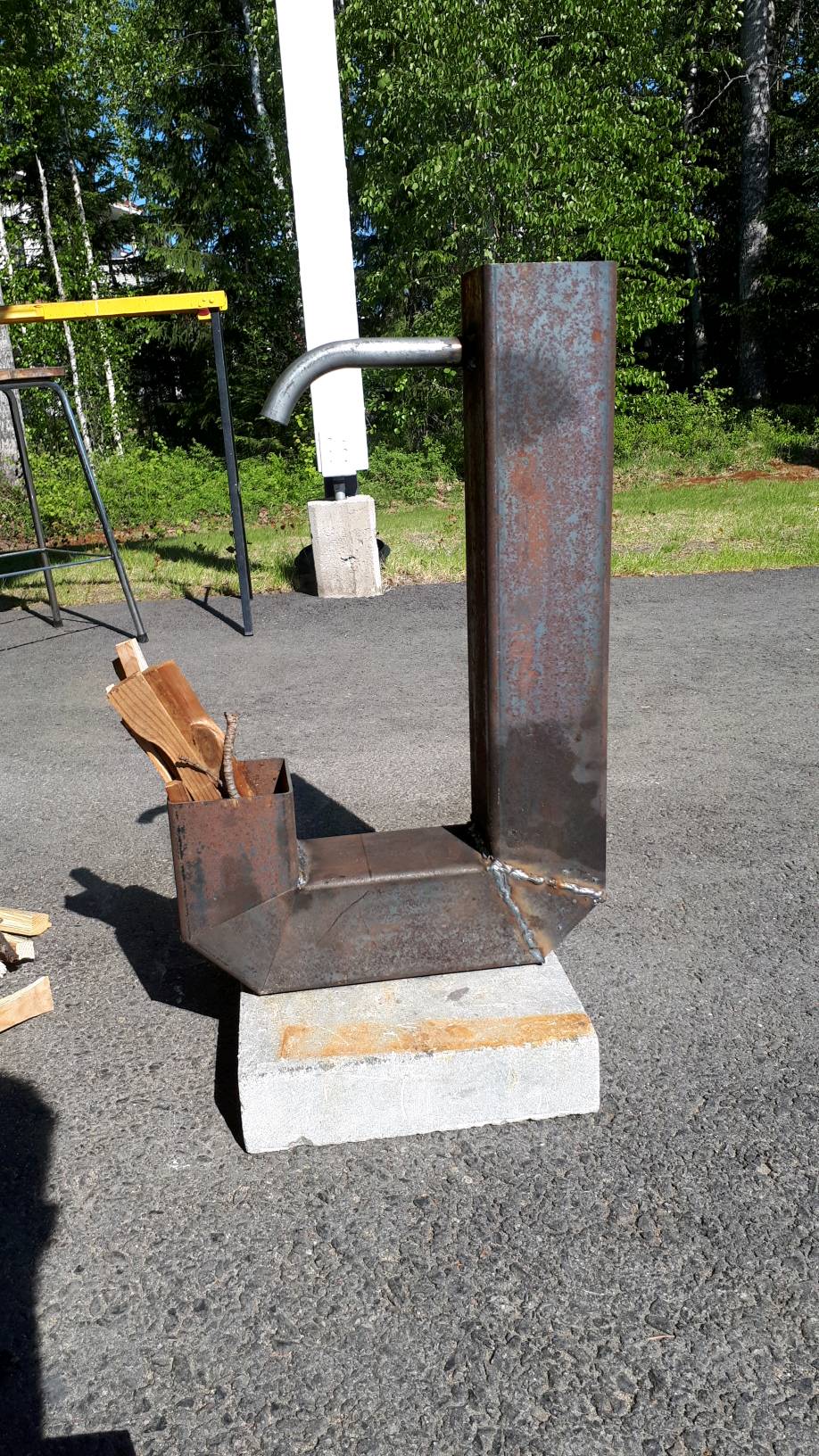 Joskus pähkäilin "raketti"-tyyppistä palopesää niin, että puut voisi polttaa pitkänä, vaikka kahden metrin mittaisena halkona. Aika paljon säästyisi työtä, jos tuollaisen saisi palamaan tasaisesti. Monta sahausta pinoamista ja muuta käpälöintiä vähemmällä saisi puun lämmöksi.