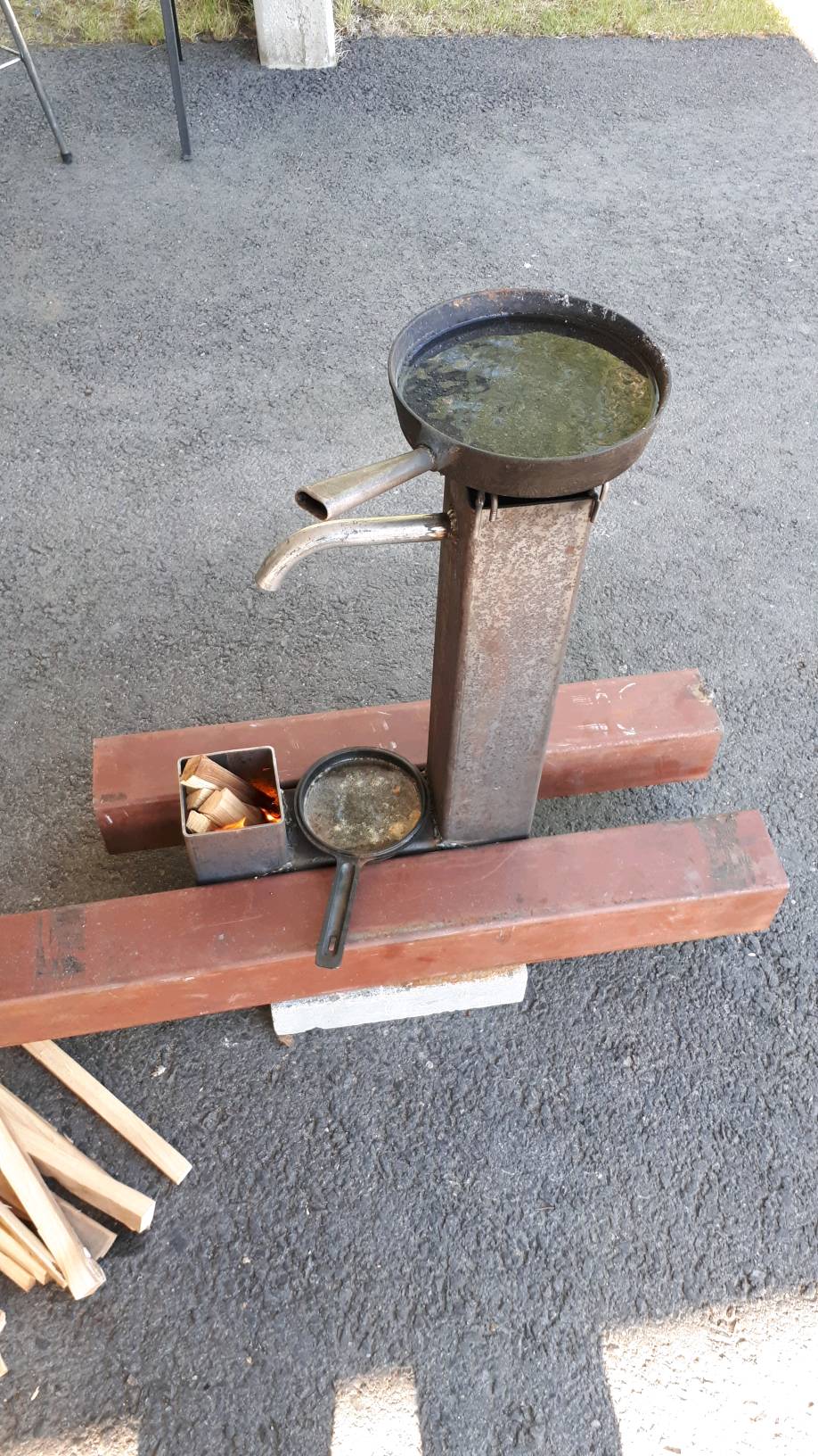 Alemmassa pannussa vesi kiehui muutamassa minuutissa. Jos tulipesän ja piipun eristäis, ni alkas kiehuun ylempikin pannu?