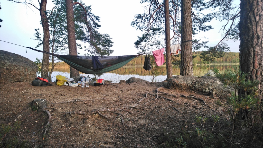 Kiertelin ensin hieman alueella ja Mäntyharjun puoleisesta päästä löytyi uusi nuotiopaikka ja niemi jossa oli riippumispuita mutta kamat kannoin kuitenkin vanhaan tuttuun niemeen jossa oli bonuksena mukavat istuinkivet.