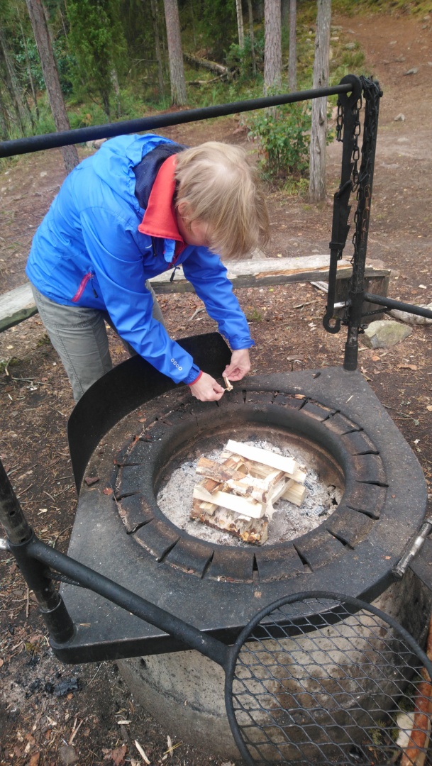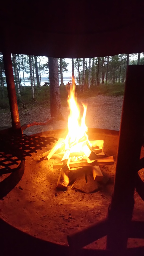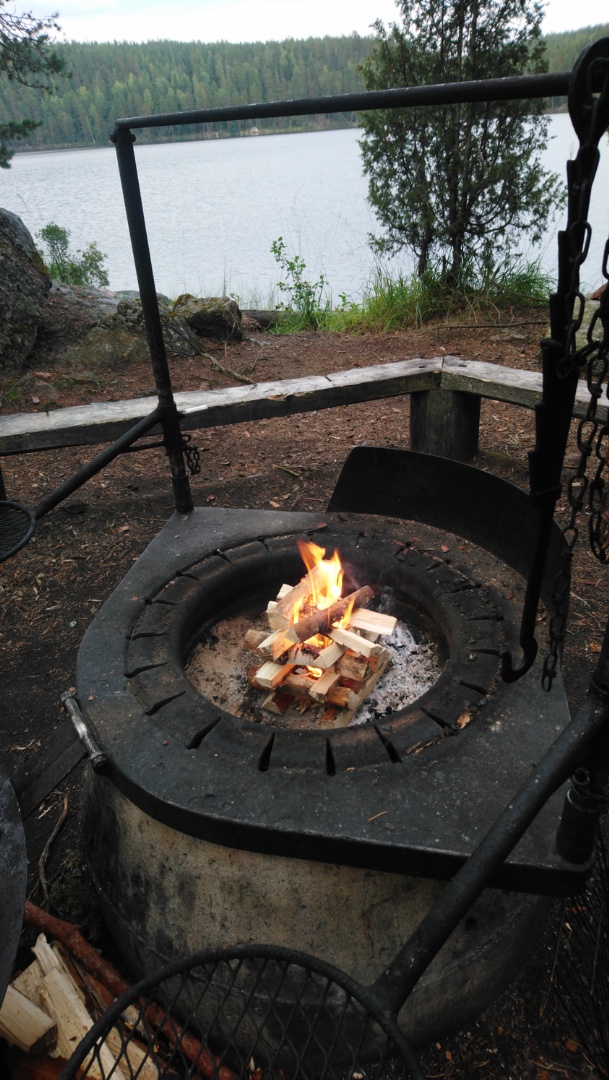 Kesän eka nuotio? on kai vähän normaalia kuivempaa ollut… pari päivää ja olisi voinut sanoa, että syksyn ensimmäinen :) kolme pientä klapia hammastikuiksi ja “hirsikehikolle”, pienempää tikkua sytykkeeksi ja tulitikku perään niin sillä saisi eväät lämmetä, ei meillä puuta tuhlata