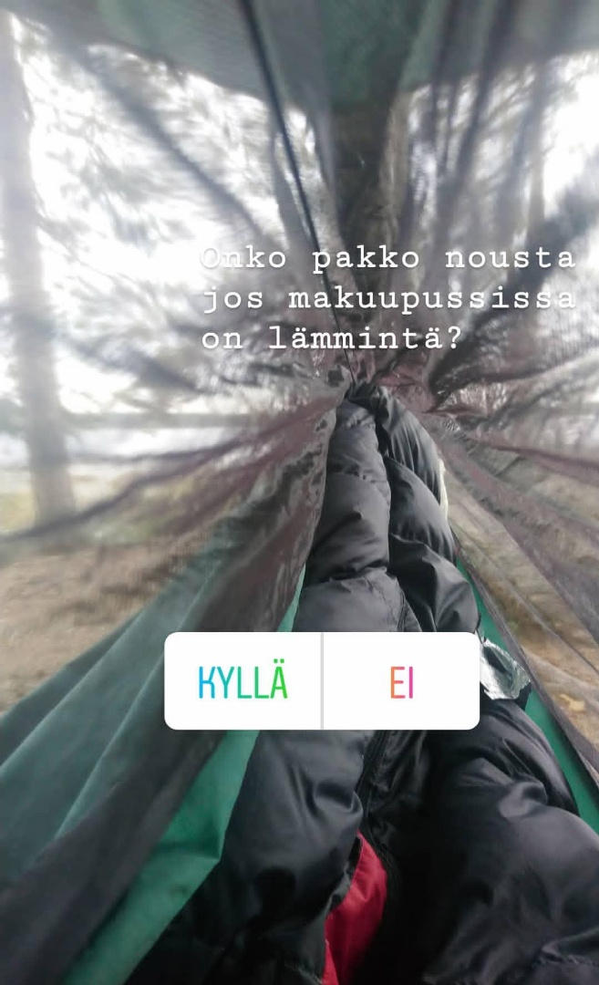 Kirjoittelin tarinoita edelliseltä päivältä makuupussin lämmössä. Mietin, että tartteeko sitä nousta kun ulkona on viileää ja makuupussissa on lämpöisää. mitäpä ei voisi sosiaalisessa mediassa kysyä
