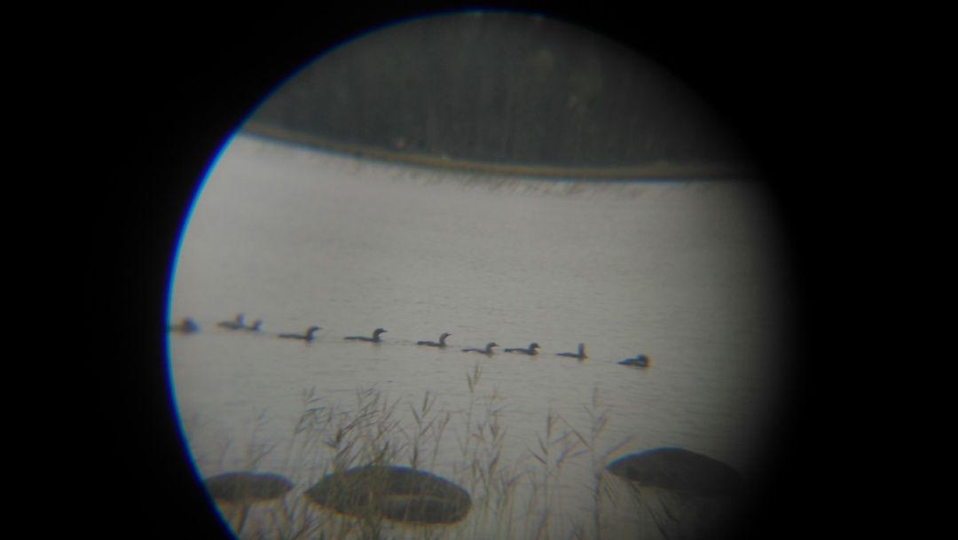Pikkuisen kirjoittelin lisää ja kävin ympäristössä kävelemässä. Lopulta rupesin kamppeita laittamaan läjään mutta se keskeytyikun lintuparvi vähän lähempänä ui ja muistin kiikarit olkalaukusta, kuikkiahan ne. Pitkään katselin ja kiikarin läpi yritin kuvata.