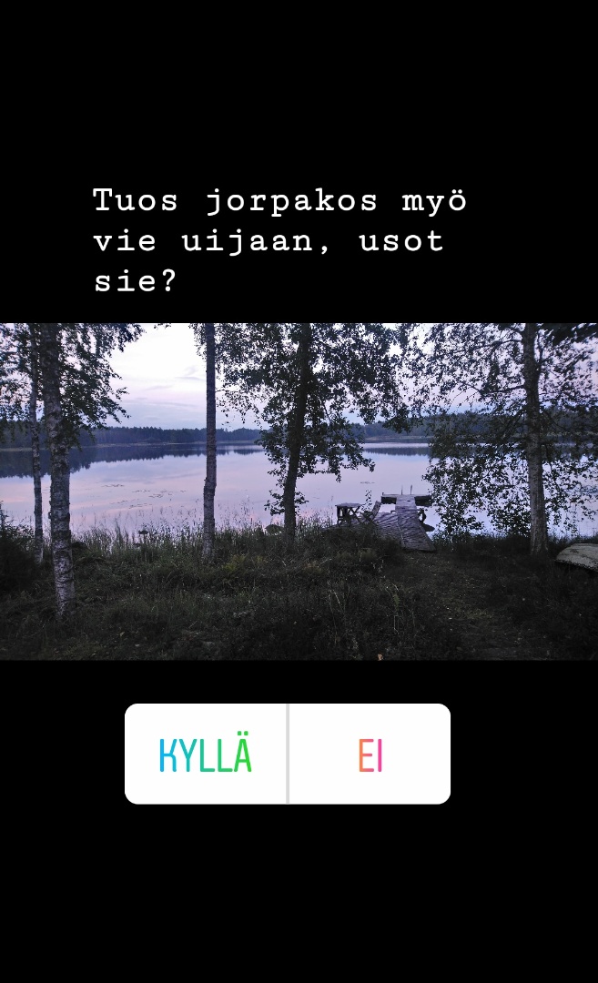 Sosiaaliselta medialta mielipidettä kysyin, että usotsie, että tuos jorpakos myö viel uijaan niin melkein kaikki uskoi, uin vieläpä kolmesti ekana iltana.