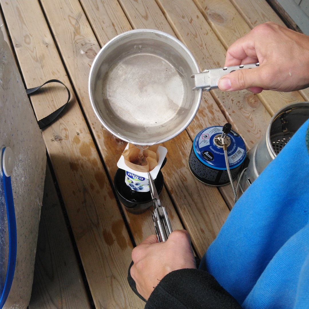 Joskus yöllä heräsin säpsähtäin, että se kahvi ja sen suodatinastia… Koska olen oman elämäni Macgyver, kaukaa viisas ja läheltä komea, takatukkaakin löytyy, tosin kiinalainen mutta kumminkin niin söin ekana allpron kauramustikkajugurtin, huuhtasin sen järvivedessä ja aloittelin keittelemään vettä trangialla. Tefalin juustohöylä oli käsillä ja sen piikeillä tökin muovipurkin pohjaan muutaman reiän ja kas! suodatinpussiasetti vai mikä se nyt on oli valmis, kovimpaan tuskaan tietysti noita puruja voisi laittaa suoraan huulen alle eli vähän kostuttaa ja muotoilee mällin :mrgreen:
