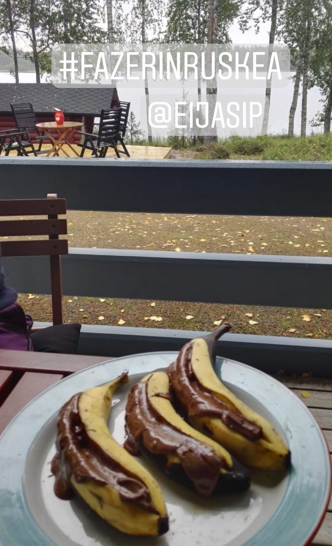 Leipomossa oli koe-erä vegaanista porkkana pullaa niin otin uteliaisuuttani, hintaa 50 senttiä… maku oli hyvä mutta rakenne turhan tiivis, ei myyjää kyllä mielipide kiinnostanut kun lähtiissä edellispäiväistä leipää ostin pussin, mietin pärjäisikö tällä käymättä kaupassa mutta ajattelin suklaata ja banaania tekevän illalla mieli kun nuotion sytyttää ja kun ne nuotiolla yhdistää, saa suklaabanaania.