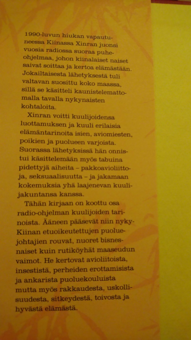 Toinen oli Xinranin Vaiennetut äänet, Kiinalaisia naiskohtaloita, joka oli pakko laskea välillä käsistään kun oli aika koskettavasti kerrottu 14 eri naisen elämäntarinaa kun elämä ei ole kuin silkkiä vaan...