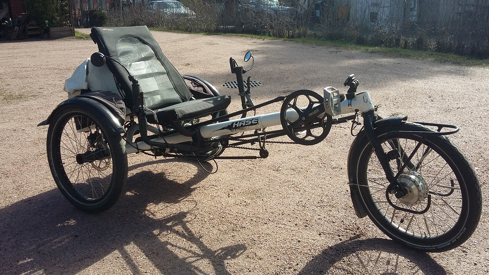 Varustelussa Rohloffin vaihtaja, tasauspyörästö, sähköavustin ja hydrauliset jarrut ja pienet sivulaukut. Avustimen akku vaihdettu valmistajan toimesta v. 2016 ja myös säilytyksen aikana säännöllisesti latailtu. Akku kestää avustuksen kertoimesta riippuen 20-40km ajomatkan. Tarvittaessa pikkurahalla lähtee mukaan myös kammenlyhentäjät ja/tai liikuntavammaisille soveltuvat erikoispedaalit.