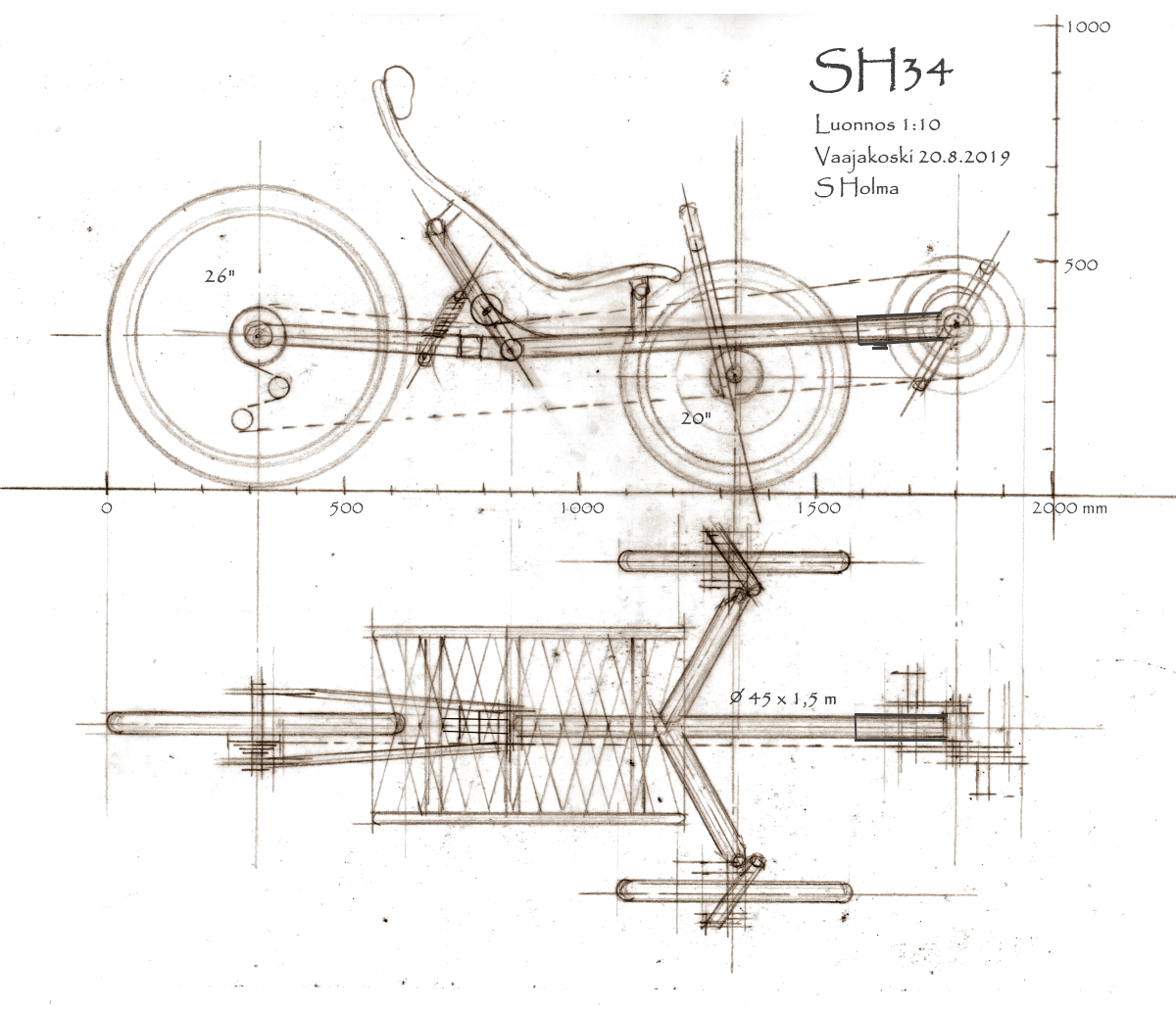 SH34:ssa yritän tehdä ideaalin 3-pyöräisen nojapyörän ja yhteenvedon kokemuksista, joita olen saanut yli 20 vuoden ajalta nojakkien suunnittelusta, rakentamisesta ja ajamisesta. Huomasin lähetettyäni viestin, että sakaari ja tavarateline olivat jääneet kuvasta pois. Kuvassa näyttää olevan muitakin puutoksia.