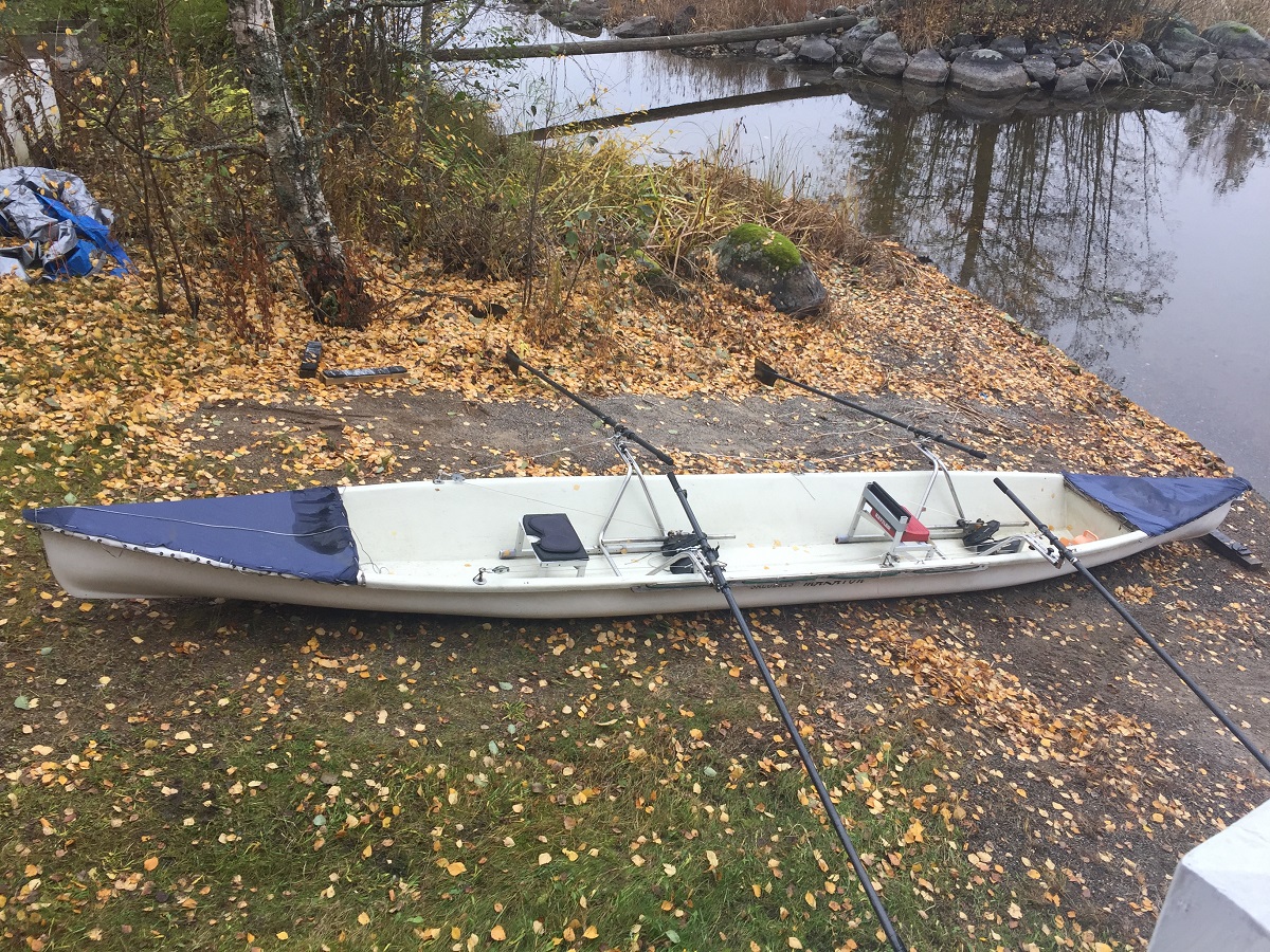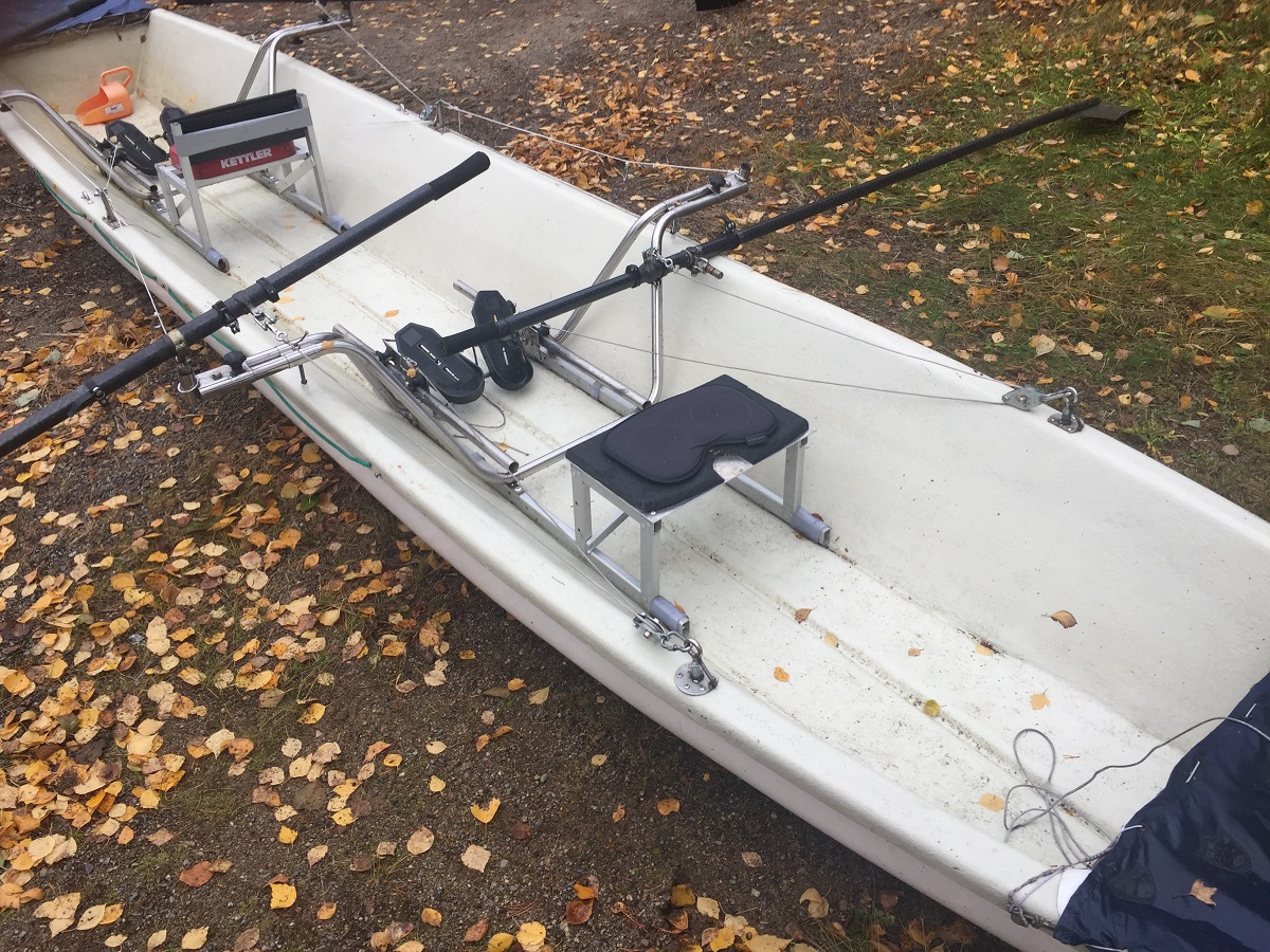 Polkemaan piti päästä vesilläkin ja hankin tuollaisen 7 metriä pitkän kuntosoutuveneen jossa on kaksi soutupaikkaa.