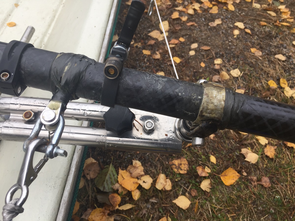 Airot on tietysti hiilikuitua, airo painaa noin 800 grammaa, lapa on kirvesmalli. Tämän jälkeen jos ottaa käteen märän puuairon niin tunne on erikoinen. Hankain on täysin laakeroitu ja täysin säädettävä, airoputken (32 mm) päällä on 35 mm putken pätkät jotka on pyörän satulaklemmarilla kiinni 32 mm putkessa ja niissä siis hankain jne. Hankaimen paikkaa ja kulmaa voi siis säätää. Lisäksi voi säätää polkimelta tulevan vedon paikkaa suhteessa hankaimeen eli kammen pituutta. Luonnollisesti pitkä kampi on tässäkin hyvä.