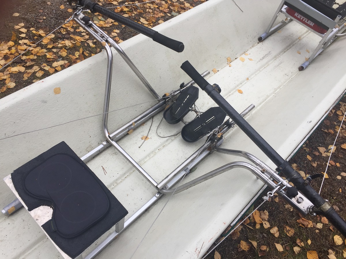 Ja tässä kuva siitä vanhasta soutulaitteesta mistä tärkeimmät osat tuli siihen jaloilla poljettavaan kelkkaan...