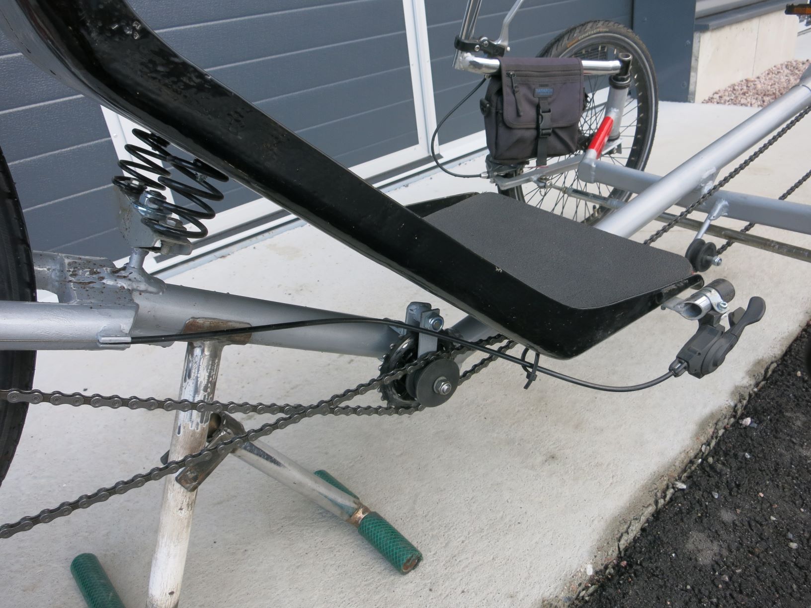 Mikäli oikein tulkitsen kuvaa niin selkänojan ja rungon välissä näyttäisi olevan jousi. Se ei ole hyvä asia polkutehon kannalta, sillä kaikki jousto pedaalin ja lapaluiden välillä on pois polkemisen hyötysuhteesta. Mikäli halut ajomukavuutta kannattaisi penkki kiinnittää kiinteästi runkoon ja siirtää jousitus takahaarukkaan.