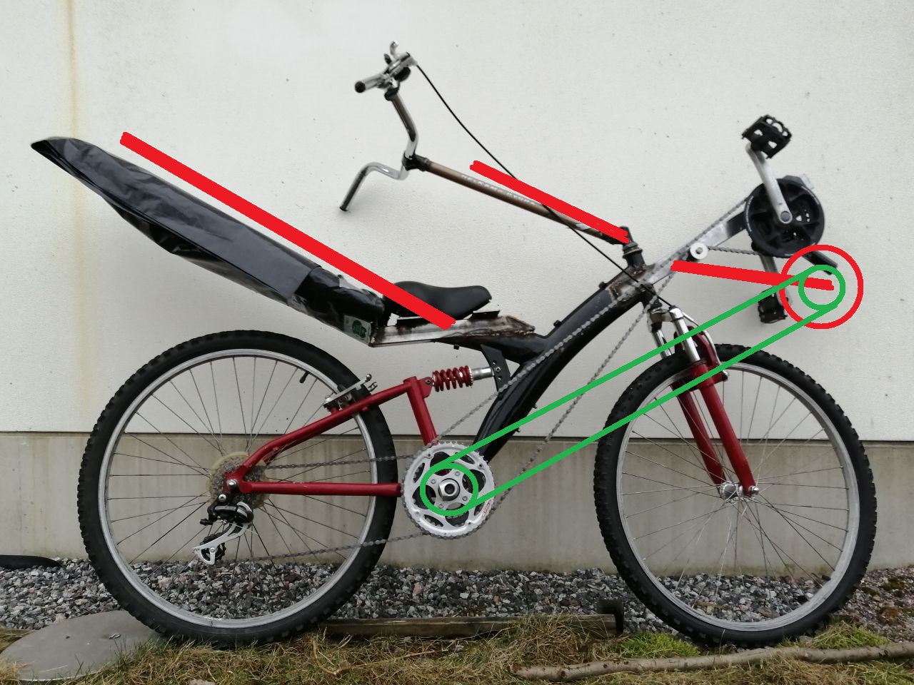 Keskiöiden välillä kulkeva ketju on tarkoitus siirtää pyörän toiselle puolelle, jolloin etuvaihtaja saadaan käyttöön alkuperäiselle paikalleen. Tämä keskiöiden välinen ketju kannattaa kai laittaa pieneltä rattaalta pienelle, jolloin polkemisvoiman momenttivarsi (nyt noin 10cm) takajousituksen nivelen suhteen on pienin ja vähiten energiaa hukkautuu jousta vastaan polkemiseen. Etupuomissa olevaa kiristysrullaa siirretään mahdollisesti taaemmas, jolloin mutka ketjussa loivenee. Poljettava keskiö oli alunperin etupuomin yläpuolella (jottei kantapää missään tilanteessa voisi ottaa eturenkaaseen kiinni), minkä takia rulla on nyt oudossa kohdassa.