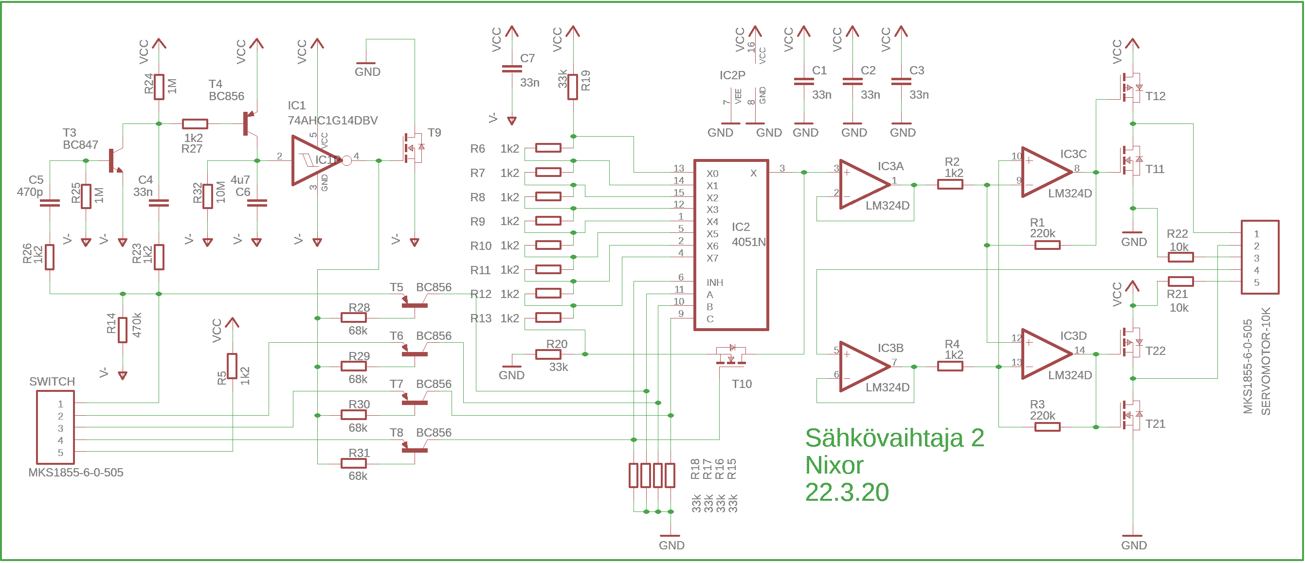 Oon suunnitellu seuraavaa sähkövaihtajaa. Laitan sen Baroniin. Painonappien tilalle laitan peukalokytkimen: https://elcodis.com/parts/1828450/PECA-4000.html. Laskuripiiriä ei nyt tarvita, vaan kytkimestä tulee binäärikoodi joka ohjaa 4051-multiplexeriä joka toimii kuten edellisessäkin versiossa. Lyhyt kytkinvärähtely ei haittaa. Virtakytkintä en aio laittaa. Kun vaihtajaa ei käytetä se menee virransäästötilaan. Sen toteutan viivepiirillä, jossa on 74hc1g14 schmitt-trigger invertteri. Vaihtaja kytkeytyy päälle muutamaksi sekunniksi aina kun peukalokytkimen 1. bitin tila muuttuu. Virransäästötilassa sähköä kuluttaa vain 74hc1g14-piiri ja sen oheiskomponenttien vuotovirrat. Tavoite olisi alle 20uA. Jos laitan vaihtajaan 7.4V 320mAh Li-po akun niin sen pitäisi kestää virransäästötilassa lähes 2 vuotta! Tuollainen akku ei itsestään purkaudu kovin nopeasti, yksi ollut ladattuna huoneenlämmössä useamman vuoden ja jännite oli silti 7.2V. 4051-piirin tuloihin ei saa kytkeä signaaleja jos sillä ei ole käyttöjännitettä. Irroitus onnistuu esim. 74hc125 piirillä.