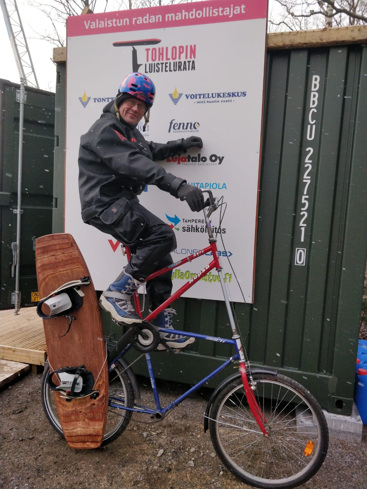 Onhan toi aika koomisen näköinen setti. Wakelauta korkopyörään sidottuna ja kuskilla kuivapuku... :shock: