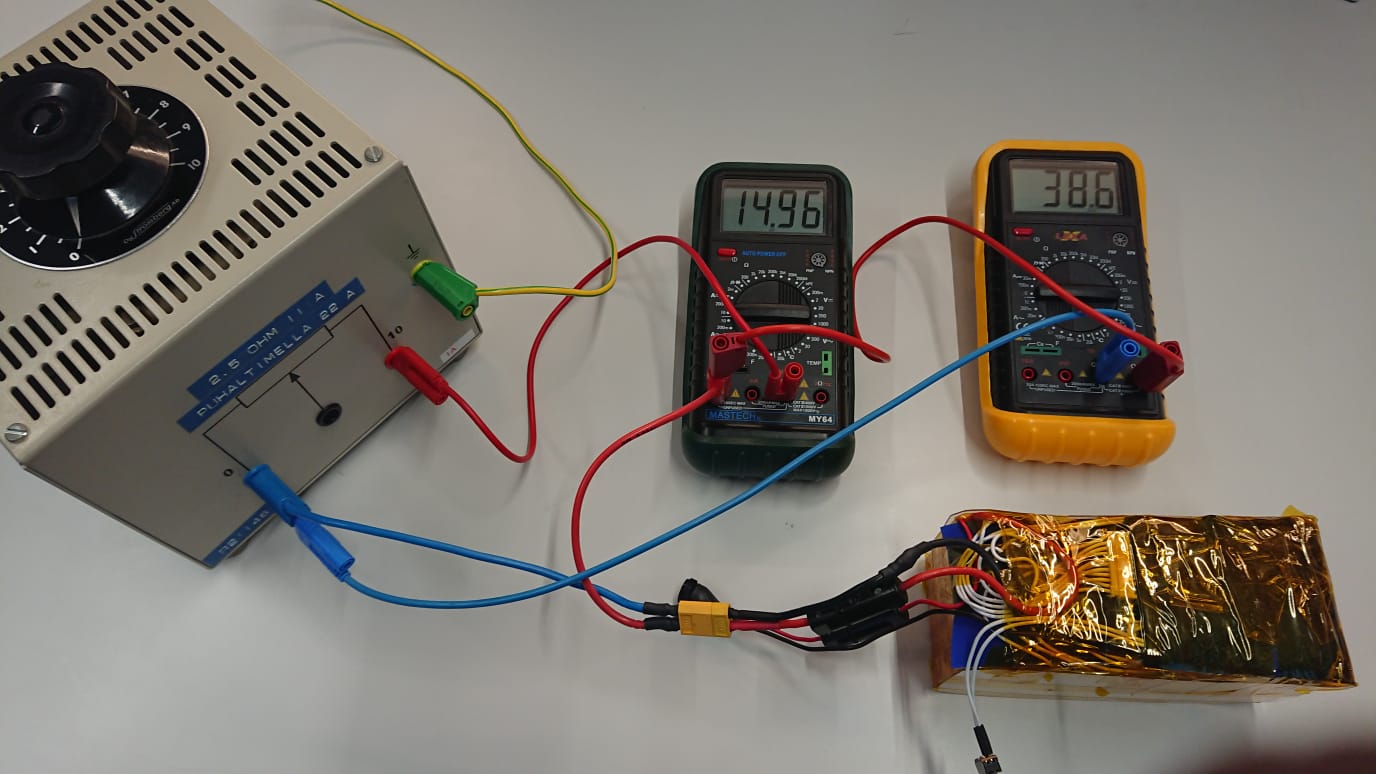 Pompula oli lähes kylläinen. Latasin sen vain vähän päälle 41 volttiin. Oli aika laittaa se testiin. Kun sattui löytymään sopivia kuormavastuksia, mikäpäs siinä. Ei Pompula röyhtäillyt rasituksesta eikä muutakaan tapahtunut vaikka varauduin välineistöllä. Kuormavastus vähän yskähteli höyryjä, mutta saattoihan tuo olla pölyäkin. Aluksi 10 ohmin vastus (4 A), seuraavaksi 5 ohmin vastus (8 A) ja lopuksi vielä kaikki mitä BMS antaa hajoamatta eli 15A. 2,8 ohmin (mitattu arvo) vastuksella muutaman minuutin. Laskennallinen sanoo, että 42 VDC, 15 A, 2,8 ohm ja 630 W. Pitäisi riittää 250-350 vatin moottoreille, jotka piikissä ottavat jotain 400-500 W välissä. En huomannut akussa enkä sen kaapeloinnissa mitään lämpenemistä näppituntumalla. Teholaskuri löytyy täältä: https://www.jussilanet.com/teholaskin.html