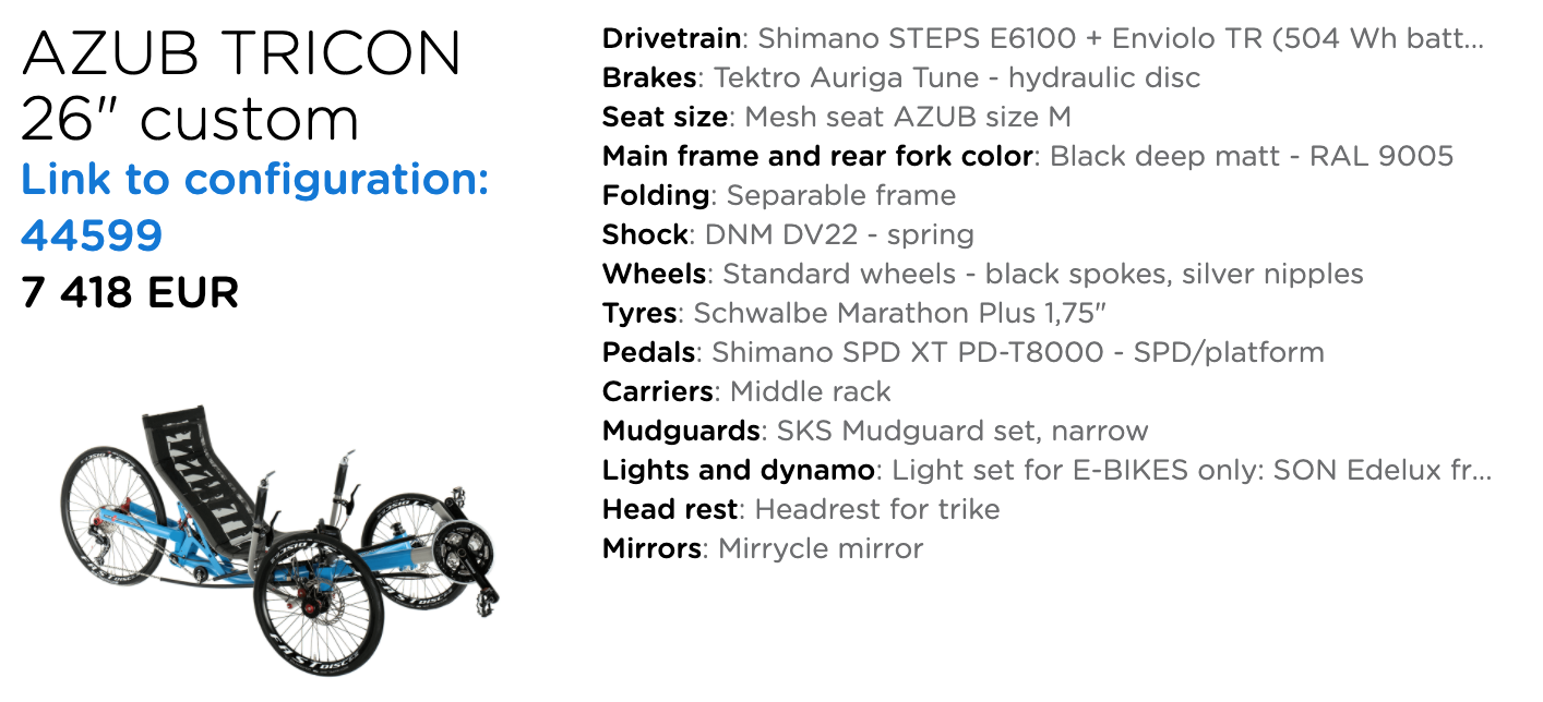 Kaarikinneri myy uusien demopyörien tieltä uudenveroisen ja erikoistilauksesta kasatun Azub Tricon 26" nojakin peruskonfiguraatiota tehokkaammalla Shimano Steps e8000 moottorilla ja Enviolo TR portaattomalla vaihteistolla. Todella tehokkaat Bush & Müllerin akkuvalot.