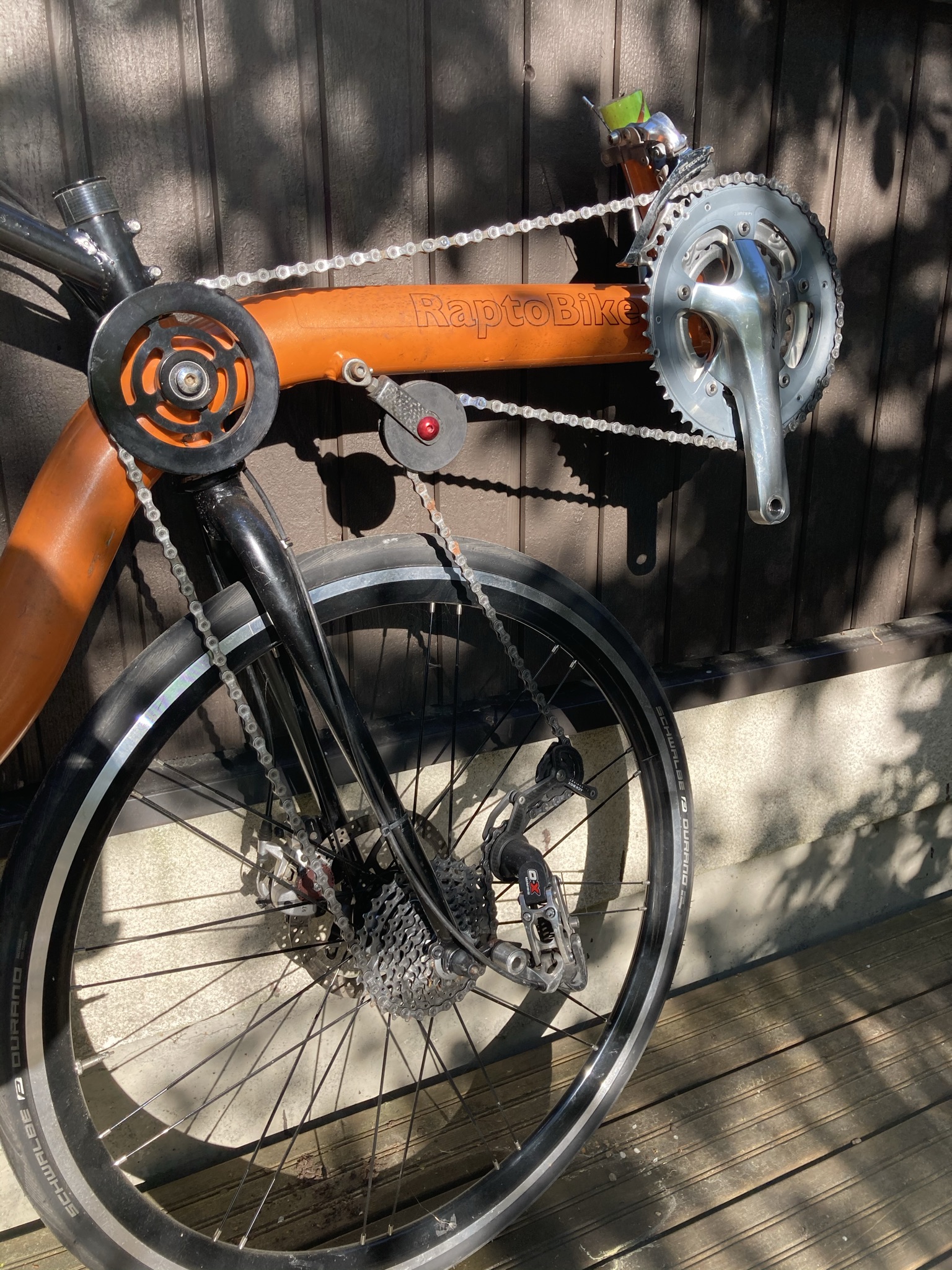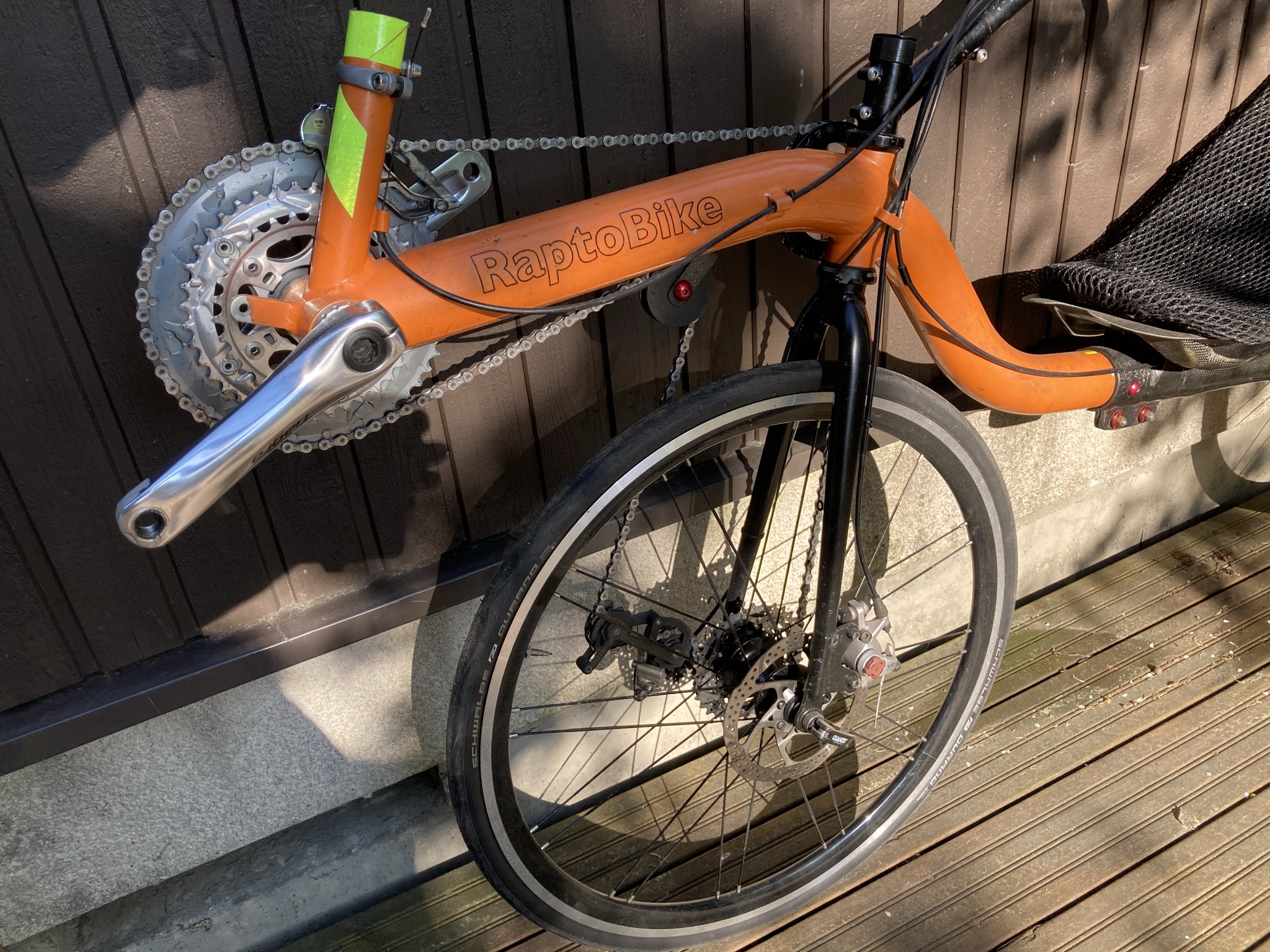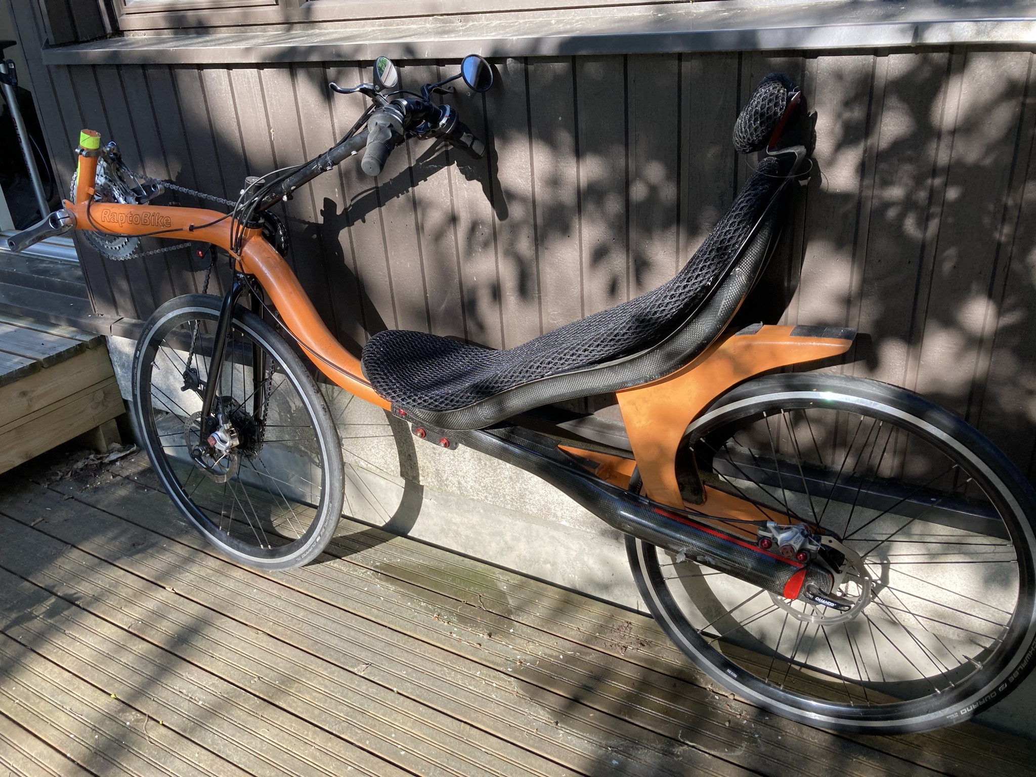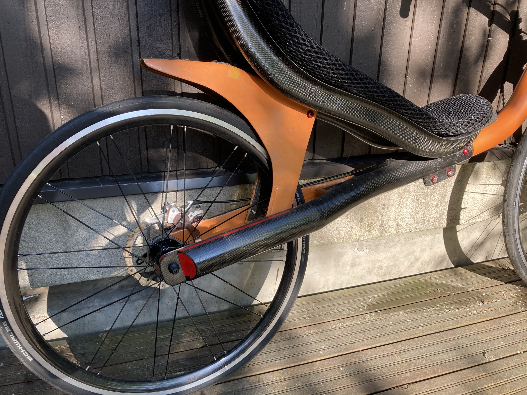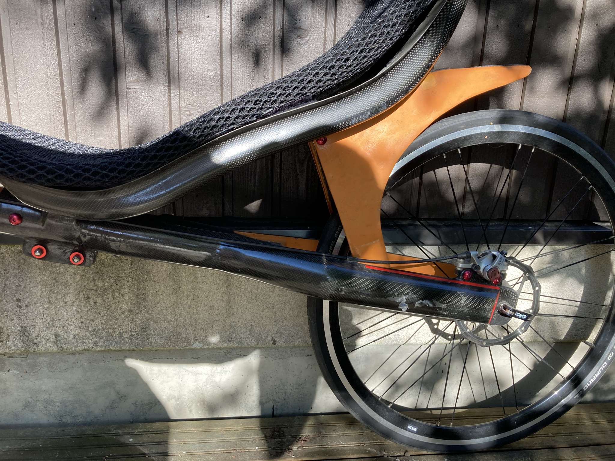 Front half chromoly steel, rear half carbon fibre runko made by Australian, Pete Heal (PoiterH on BentriderOnline. Ostin pyörän häneltä)